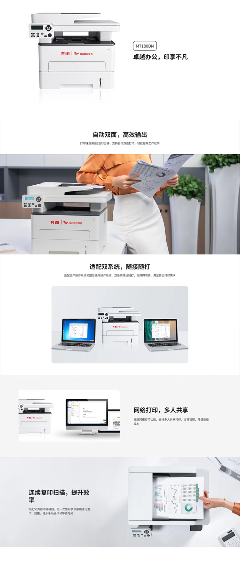 奔图(PANTUM) M7180DN A4黑白激光多功能一体机 32ppm/自动双面 打印/复印/扫描 支持国产系统