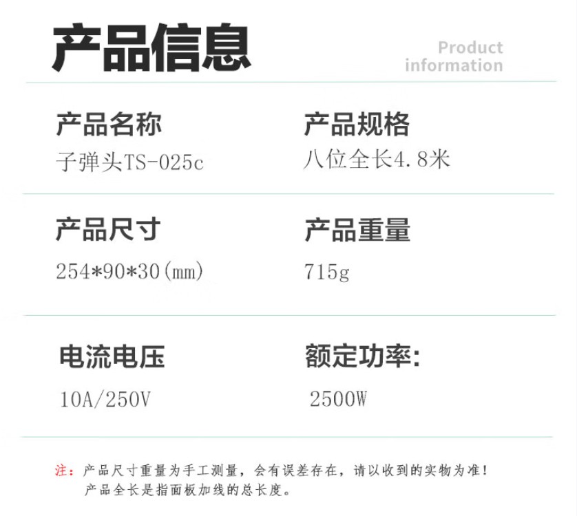 子弹头 TS-025c新国标4.8米总控安全插座/插排/插线板