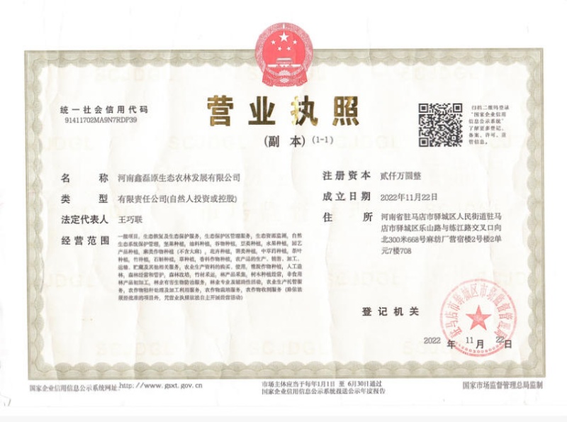 河南鑫磊原生态农林发展有限公司成立于2022年11月22日,注册地位于河南省驻马店市驿城区人民街道驻马店市驿城区乐山路与练江路交叉口向北300米668号麻纺厂营宿楼2号楼2单元7楼708,法定代表人为王巧联。经营范围包括一般项目:生态恢复及生态保护服务;生态保护区管理服务;生态资源监测;自然生态系统保护管理;坚果种植;油料种植;谷物种植;豆类种植;水果种植;园艺产品种植;麻类作物种植(不含大麻);花卉种植;薯类种植;中草药种植;茶叶种植;竹种植;石斛种植;草种植;香料作物种植;农产品的生产、销售、加工、运输、贮藏及其他相关服务;农业生产资料的购买、使用;橡胶作物种植;人工造林;森林经营和管护;森林改培;竹材采运;林产品采集;树木种植经营;非食用林产品初加工;林业有害生物防治服务;林业专业及辅助性活动;农业生产托管服务;农作物秸秆处理及加工利用服务;农作物栽培服务;农作物收割服务(除依法须经批准的项目外,凭营业执照依法自主开展经营活动)