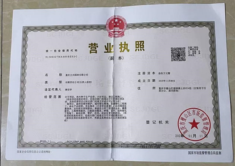 重庆立兴园林有限公司成立于2018年11月06日,注册地位于重庆市璧山区福禄镇土田村4组,法定代表人为唐安学。经营范围包括许可项目:林木种子生产经营;木材采运;建设工程施工。(依法须经批准的项目,经相关部门批准后方可开展经营活动,具体经营项目以相关部门批准文件或许可证件为准)一般项目:森林经营和管护;城市绿化管理;园林绿化工程施工;林业产品销售;劳务服务(不含劳务派遣);水利情报收集服务;水利相关咨询服务;承接总公司工程建设业务;灌溉服务;工程管理服务;白蚁防治服务;种植:苗木;园林绿化工程施工;森林经营、管护、改培;林业有害生物防治。(依法须经批准的项目,经相关部门批准后方可开展经营活动)。(除依法须经批准的项目外,凭营业执照依法自主开展经营活动)