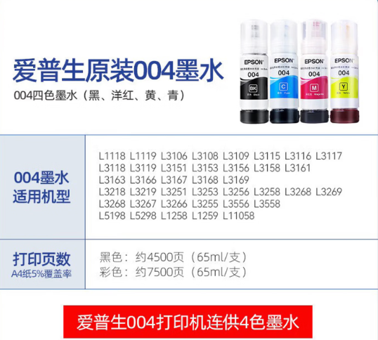 爱普生(EPSON) 004原装墨水墨盒 四色套装 爱普生L3115墨水 L3116 L3117 L3118 L3119 L3153打印机墨水 004系列黑青红黄四色