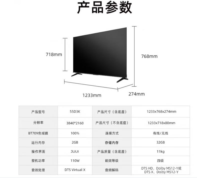 海信(Hisense) 55D3K 65D3K 75D3KD MEMC 防抖语音智控 U画质引擎平板电视品质尾货 55D3K 智能电视 官方标配 x 556575英寸