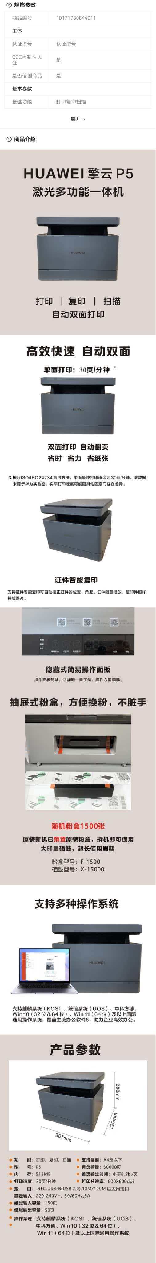 华为(HUAWEI) 擎云P5激光打印机国产化信创多功能一体机